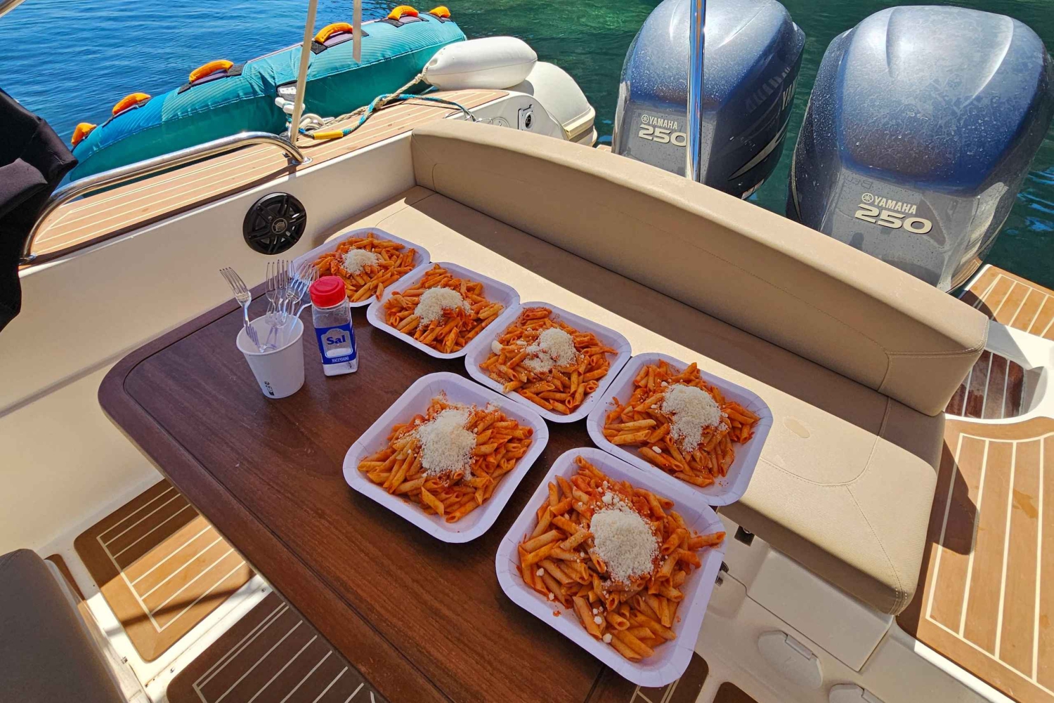 1x højhastighedsbåd Capelli 900 WA 500CV med skipper. 1 x Seascooter 1000W med 3 batterier. 1 x Subwing 1 x SUP paddleboard. 10 x snorkeludstyr. 1x Donut Jobe 3 personer. 12x FROKOST/MIDDAG: Pasta med hjemmelavet tomatsauce og tun af høj kvalitet eller parmesanost i stedet. 24 x drikkevarer 10 x våddragter til 10 passagerer inkluderet i prisen.Important Information