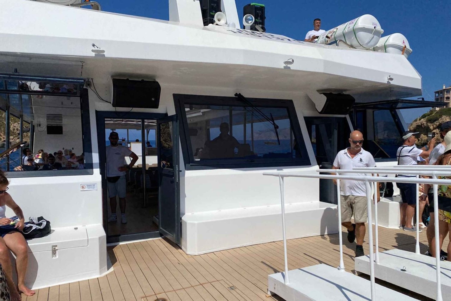 Disfruta de un relajante crucero por la costa suroeste de la isla de Mallorca. Toma el sol en la cubierta mientras te diriges a las aguas protegidas y las reservas marinas. Sube al catamarán en el punto de encuentro y acomódate para disfrutar del crucero. Tómate algo, come y broncea tu piel o pídelo en uno de los dos bares de a bordo (bebidas disponibles con coste adicional). Sumérgete en las aguas cristalinas de la isla y explora los coloridos paisajes submarinos. Busca vida marina y peces impresionantes con el equipo de esnórquel proporcionado (depósito de 20 €). Lo que necesitas saber: para este viaje ofrecemos servicio de traslado desde Arenal, Playa de Palma y la zona de Calvia. El barco sale de Santa Ponsa y el traslado te llevará allí y te traerá de vuelta después del viaje. La hora estimada de llegada es 1 hora después del final de la actividad.Includes