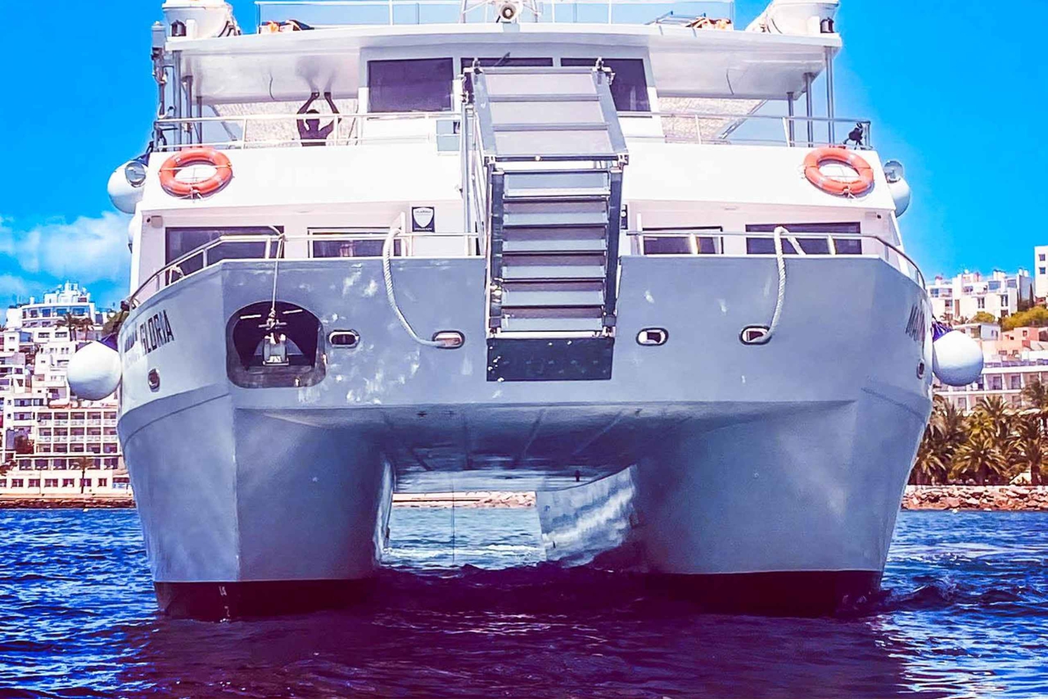Embarquez à bord d'un bateau confortable à l'embarcadère de Playa den Bossa à Ibiza. Imprégnez-vous de la beauté de la mer et du littoral tout en dégustant des boissons sans alcool, de la bière, de la sangria et de l'eau pendant votre croisière vers Es Palmador et Ses Illetes. Dégustez un délicieux repas entre deux escales, composé d'une paella aux fruits de mer, d'une paella au poulet et d'une paella végétalienne, accompagnées d'une salade mixte fraîche, de pain et d'aïoli. Plongez dans le plaisir avec des paddleboards, des gonflables, des matelas flottants et des frites de piscine lors de 3 escales passionnantes : Es Palmador (1h30) : pagayez le long de la côte et participez à diverses activités nautiques. Ensuite, savourez le repas servi à bord. Ses Illetes (1h30) : faites de la plongée avec tuba dans des eaux cristallines et participez à d'autres activités nautiques. Quai de Formentera (13h00) : débarquez pour profiter de votre temps libre sur l'île et explorer ses plages de sable avant de revenir plus tard avec nos bateaux. Premier retour : départ de Formentera à 13h15 sur le même catamaran, arrivée à Ibiza à 14h15. Deuxième retour : départ à 18h15 avec open bar et collations également fournies sur le chemin du retour depuis Formentera.Includes