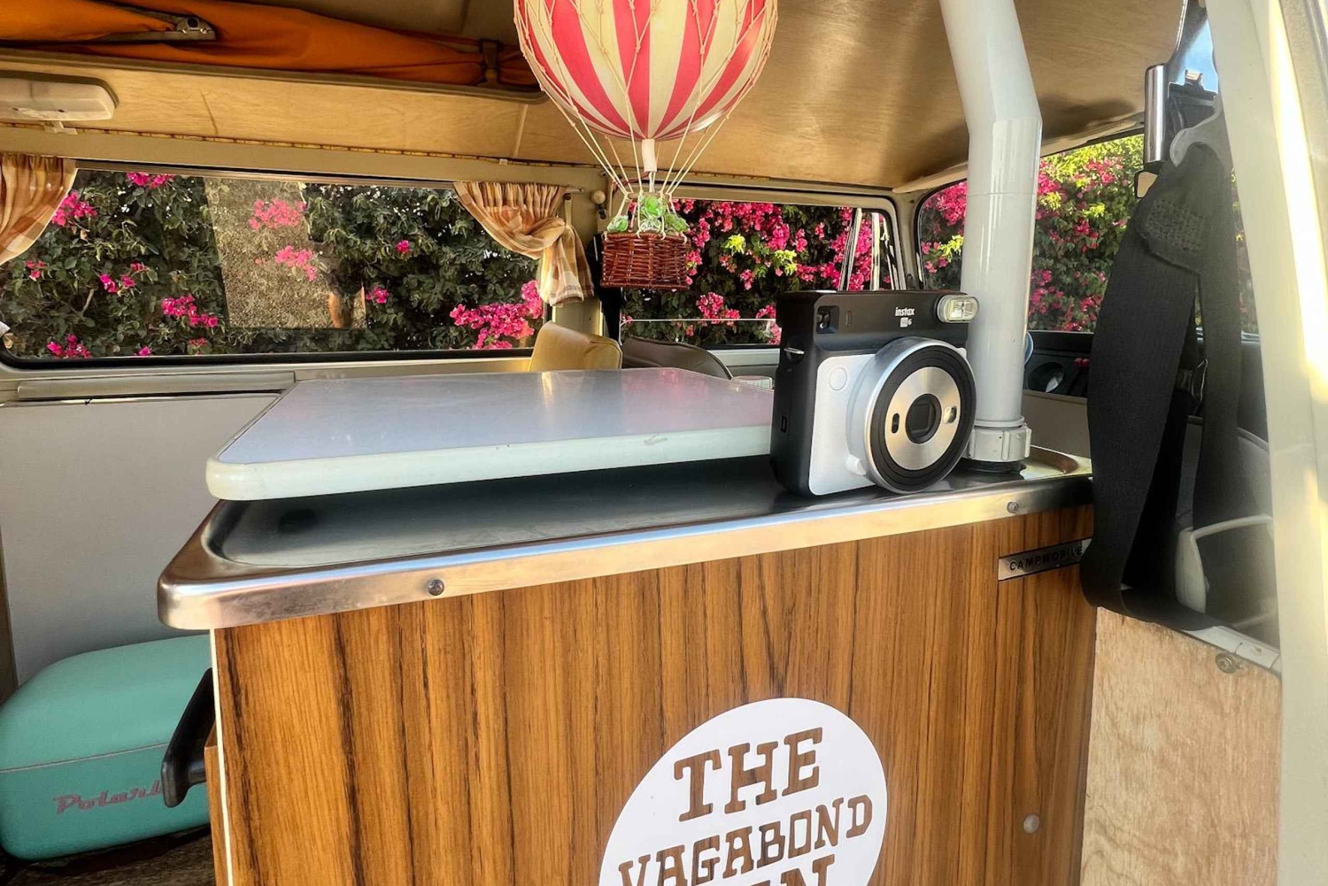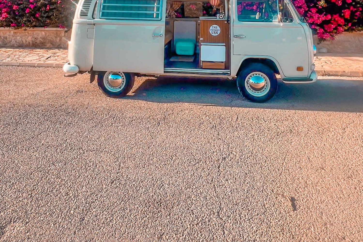 Embark on a journey back in time with our Vintage Sunset Tour and discover the hidden treasures of Mallorca in style. Prepare to be enchanted as we take you on a nostalgic adventure to secluded turquoise coves, breathtaking viewpoints, and the island's best-kept secrets. As you cruise along the scenic coastal roads in our vintage vehicles, soak in the stunning views and feel the cool breeze caress your skin. Our knowledgeable guides will lead you to lesser-known spots, away from the crowds, where you can truly immerse yourself in the beauty of Mallorca's untouched landscapes. Capture every moment of your adventure with our Polaroid cameras, ensuring that you have tangible memories to cherish for years to come. Enjoy a refreshing selection of beverages from our onboard cooler, including a bottle of chilled cava to toast to the magic of the moment. Indulge in a gourmet picnic experience amidst nature's splendor, complete with fresh fruits, snacks, and local delicacies. Enhance your photoshoot with vintage props and accessories provided for that perfect retro touch. As the golden hour approaches, we'll whisk you away to one of the island's hidden gems, a secluded spot known only to locals, where you can witness a mesmerizing sunset over the Mediterranean Sea. Set the mood with your favorite tunes playing on our portable speaker, and savor the tranquility of the moment as the sky transforms into a canvas of vibrant colors. Join us for an unforgettable journey through Mallorca's best-kept secrets. With our Vintage Sunset Tour, every moment is a treasure waiting to be discovered.Includes