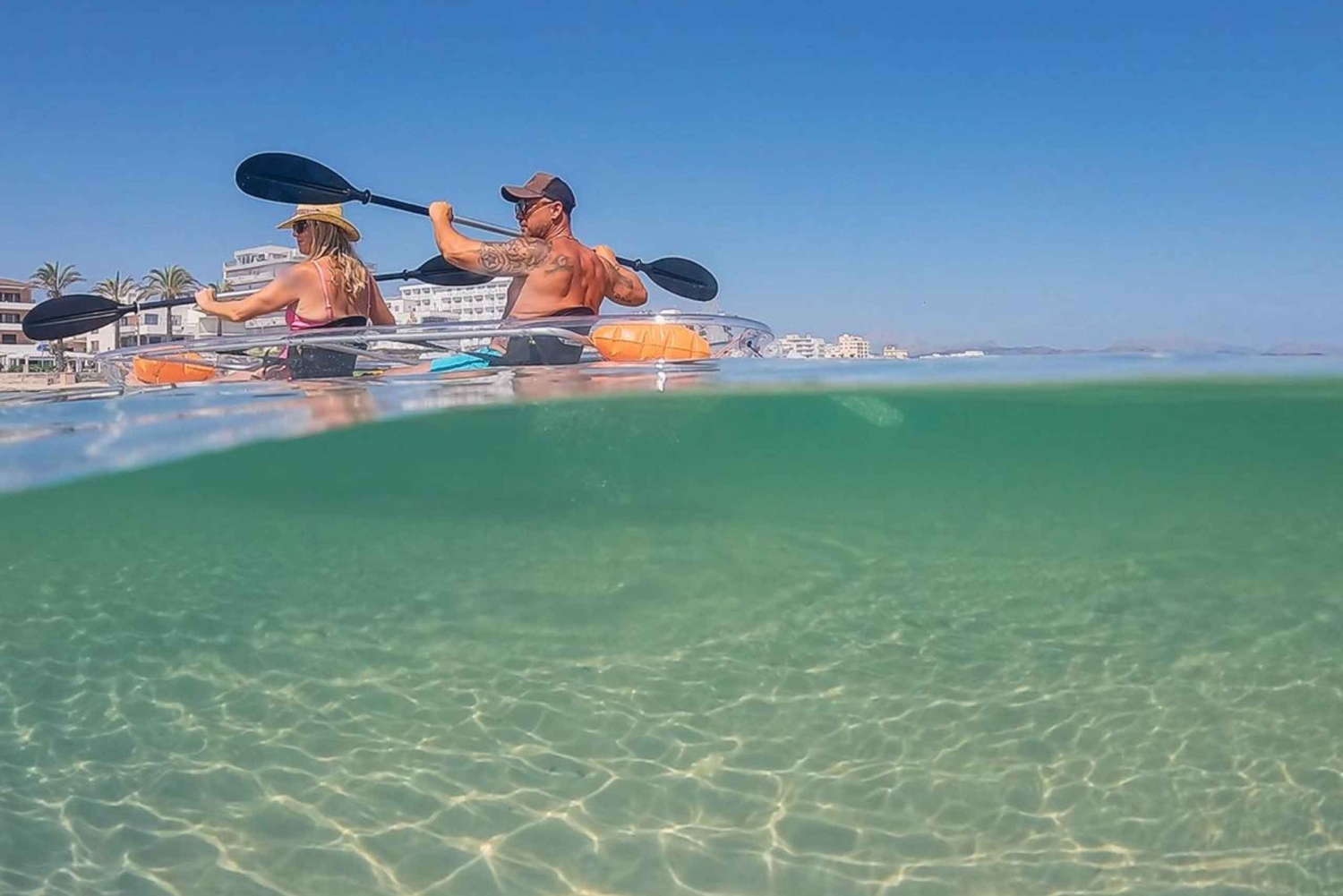 Paddle a transparent kayak across the crystal-clear waters of Can Picafort. Ideal for unforgettable photos, special moments, and pure summer vibes.